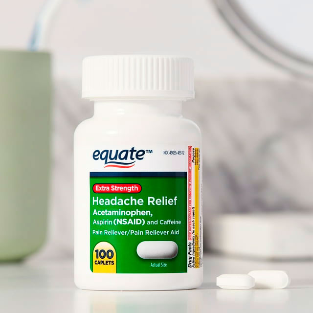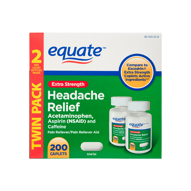 Controle sus dolores y molestias con Equate Extra Strength Headache Relief Caplets. Equate Extra Strength Headache Relief Caplets alivia temporalmente dolores menores debido a un dolor de cabeza, frío, artritis, dolor de muelas, dolores musculares y calambres premenstruales y menstruales. unidad de estas cápsulas de acción rápida está formulada con 250 miligramos de acetaminofeno, 250 miligramos de aspirina, un antiinflamatorio no esteroideo y 65 miligramos de cafeína para darle el alivio del dolor de cabeza que necesita para volver a su día. Combate los dolores y molestias con las pastillas de alivio de dolor de cabeza Equate Extra Strength. Este producto está destinado para su uso por adultos y niños de 12 años de edad y mayores.