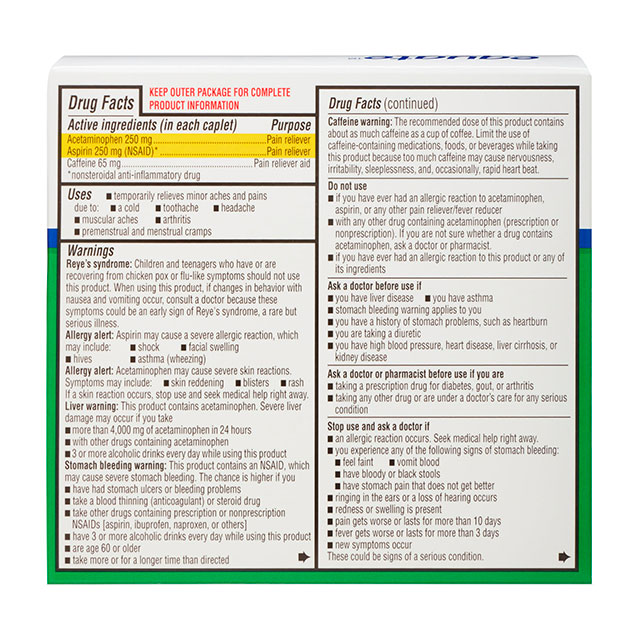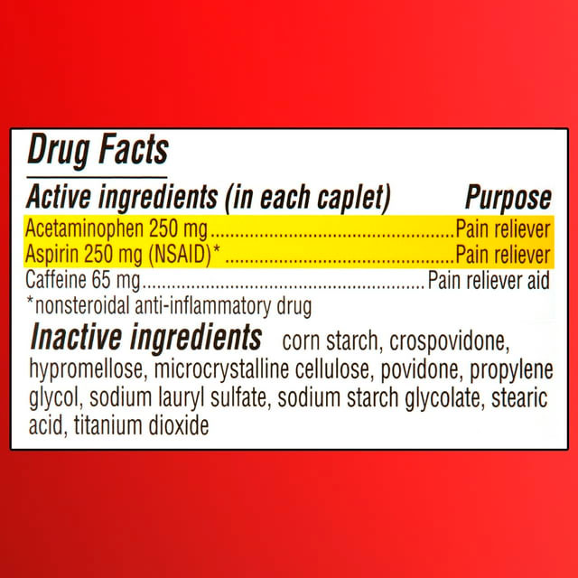 - Ingredientes activos (en cada comprimido): Acetaminofeno 250 mg (alivio del dolor), aspirina 250 mg (AINE) (alivio del dolor), cafeína 65 mg (ayuda para el alivio del dolor)
