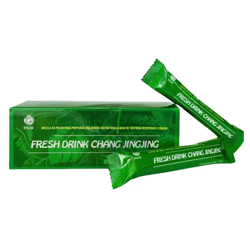 Ingredientes: Cebada en polvo, Bayas de Goji (fruto), Gan Cao(raíz), Diente de León (flor y hojas), Crisantemo (flor), dextrina resistente, ácido cítrico (E330), citrato de sodio (E331), dióxido de silicio (E551), sucralosa (E955), celulosa microcristalina(E460i). Sabor a hierba verde.