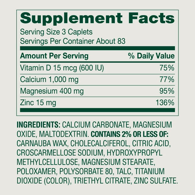 - 1000 mg de calcio, 400 mg de magnesio, 15 mg de zinc y 15 mcg (600 UI) de vitamina D3 por porción
