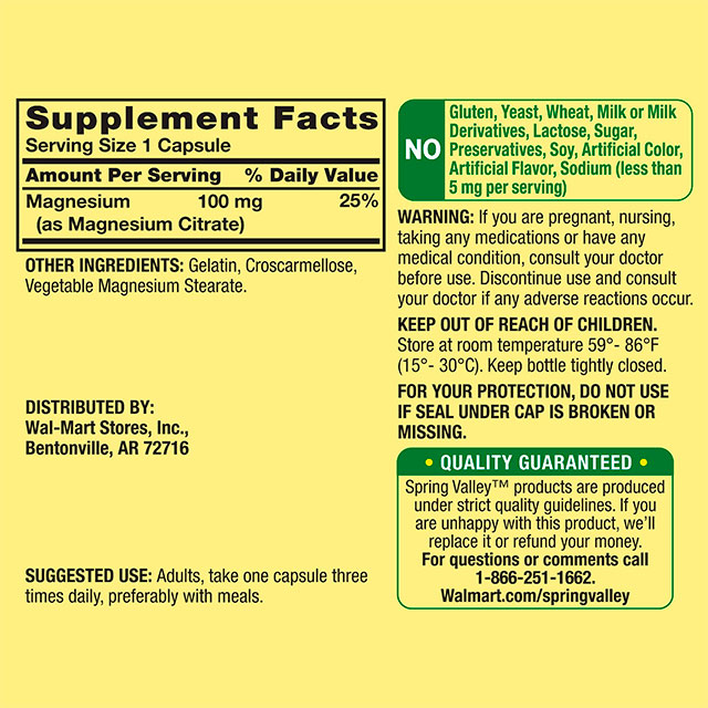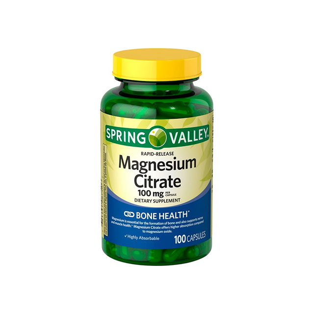 - Spring Valley Rapid-Release Citrato de magnesio Salud ósea Cápsulas de suplementos dietéticos, 100 mg, 100 unidad