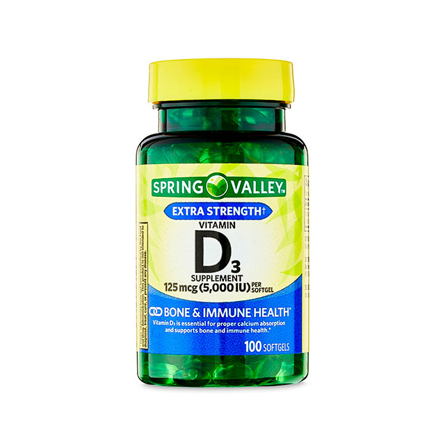 - Suplemento de vitamina D3 extra fuerte de Spring Valley para la salud ósea e inmune, 125 mcg (5000 UI), 100 unidad